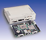 The internal mount for the board has been moved up slightly to make room for the SO DIMM and CompactFlash slots on the underside of the board. Space for one PC/104 expansion module exists within the chassis, while attachment hooks are located on the top of the chassis for one to mount a 2.5" HDD if so desired. There are hooks on the bottom of the MBPC-200 to attach a power supply. Two power supply options for this product are currently available: the PS-25D, which is a 25 W DC-DC power supply (see previous article), and the PS-50A, which is a 50 W AC-DC power supply.