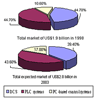 The report, "Global Markets and User Needs for Industrial Distributed/ Remote I/O, " predicts that the growth of PC-based systems is expected to displace many current DCS and PLC systems. It states that the market for remote and distributed I/O products used only with PC-based systems is projected to grow by 19% per year from US$201 million in 1998 to US$476 million in 2003; or 11% of 1998's total market to about 17% of 2003's total market.