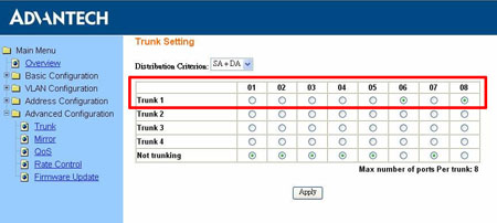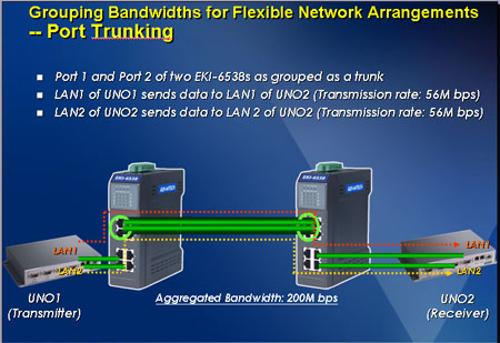 Advantech’s EKI-6538 supports 802.3ad: port trunking; it allows two or more ports on the EKI-6538 to be grouped together and act as one logical path, which can be used to increase the bandwidth between two EKI-6538s. In some cases, these paths can also provide redundancy.