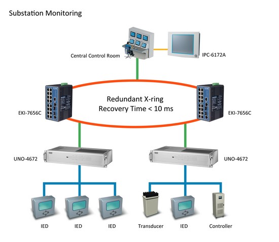 In order to maintain control of the substations, even during a network failure, EKI-7656C, a redundant fiber-optical managed industrial Ethernet switch with 2 gigabit combo ports and 16 fast Ethernet ports, was installed. It also comes equipped with a proprietary redundant network protocol, the Advantech developed X-ring, which provides users with an easy way to establish a redundant Ethernet network with an ultra high-speed recovery time of less than 10 ms.