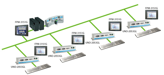 To meet the customer's requirements, Advantech's ThinManager ready hardware, consisting of the UNO-2053GL, ACP firmware and ThinManager software was presented. This deployment required the installation of ThinManager and HMI software on the server only, and the UNO-2053GL acted as a thin Client on the plant floor. 230 UNO-2053GL with AMD Geode™ LX800 processors, were installed across the four sites. The UNO-2053GL has no operating system or storage installed; each time the server boots, ThinManager sends the control software to the UNO-2053GL over the network and it then runs the small Linux operating system in RAM. The UNO-2053GL with an operating temperature range of -10 ~ 55°C (14 ~ 131°F) has been designed specifically for harsh industrial environments, and its rugged aluminum chassis protects the fanless and cableless design from the rigors of the factory floor. To guard against network failure, each UNO-2053GL has dual LAN ports that will automatically switch should one go down; thus, data will be protected and successfully transferred and stored on the management server. The management server is stored in a separate air conditioned room with UPS systems and a back-up server. On the factory floor, each UNO-2053GL is connected to a flat panel such as the IP65 compliant 15” FPM-3151G for onsite management.