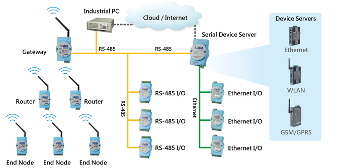 研华公司的ADAM-2000系列提供了工业级无线传感器网络I/O解决方案,采用IEEE 802.15.4无线技术,并支持星形,树形和网状拓扑结构。ADAM-2000系列提供了低功耗,高性价比和可靠的无线网络远程监控解决方案。ADAM-2000系列模块安装后,无需进一步的设置,便可自动建立最适合的控制系统的网络拓扑结构。ADAM-2000系列中的几种型号如ADAM-2520Z可以作为协调器或网关,ADAM-2510Z可以作为路由器,ADAM-2051Z和ADAM-2051PZ可以作为数字输入,ADAM-2031Z可以作为继电器输出和传感器模块。在无线传感器网络中,作为从终端节点采集数据的网关ADAM-2520Z必不可少。有Modbus RTU协议的支持,ADAM--2000系列可以轻松地与任何SCADA或Modbus RTU兼容的系统集成,扩大控制系统的覆盖范围。