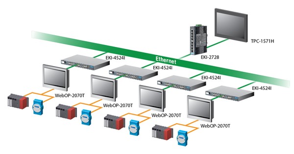 A total of 84 Advantech WOP-2070T, 7" WVGA Operator Panels, were installed on the production lines to collect a variety of signals from on-site devices such as PLC, driver and stepper motor and this data can be transmitted to 15" Touch Panel Computers (TPC-1571H) in the control center via the two kinds of Ethernet Switches (EKI-4524 and EKI-2728).