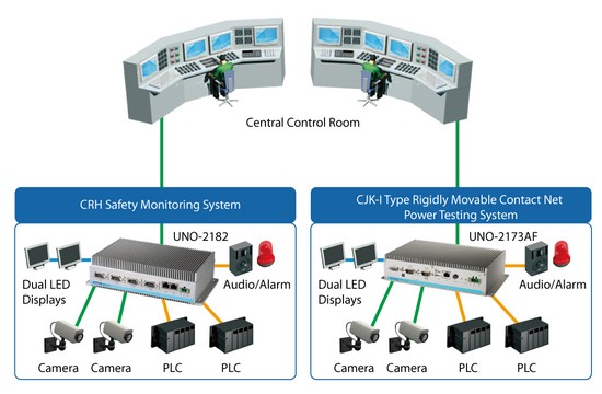 因为CRH安全监控系统必须一周每天24不间断工作,需要处理大量数据,强固型UNO-2182具Intel® Core™ 2 Duo处理器,是满足系统主机的最佳选择,有效管理PLC和现场其他周边设备。另一方面,通过能量之星认证的UNO-2173AF具Intel® Atom™ N270处理器,是精选的用于CJK-I型刚性可动接触网的铁路电力测试系统,实现基本运算和数据处理。在监控和测试系统中,来自PLCs的数据传送到UNO-2182和UNO-2173AF实时动态显示各种设备的参数及曲线,包括信号灯、LED监视器、操作室指示灯,通过生动的人机界面结合音频和视频显示,允许用户通过影像轻松管控其他设备。