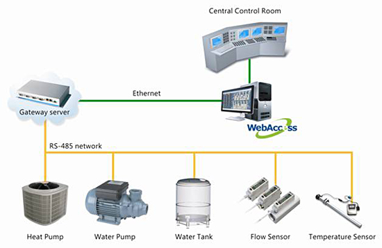 The sensors (including those for temperature, flow and electricity consumption, etc.) send their data via an RS-485 network up to the gateway server which then transmits the data via a TCP/IP network to the monitoring control computer. The user can log in the WebAccess monitoring control web pages via the Internet. The system supports TCP/IP communication protocol with an open network structure, which allows for remote test and automatic monitoring control. The WebAccess monitoring control pages include real time operation data, historical trend and regression analyses.