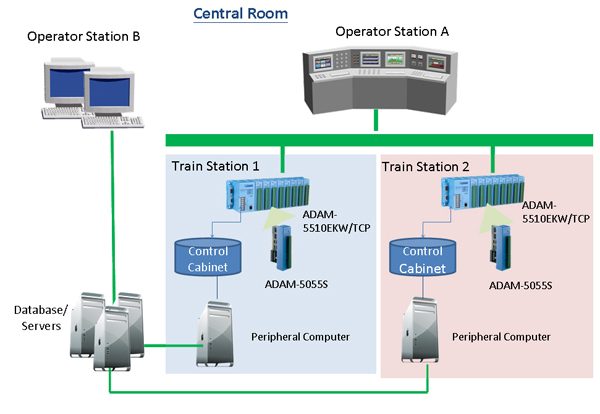 Advantech’s ADAM-5510EKW/TP PAC is placed in every railway station, and along the railway route there are 40 ADAM-5510EKW/TPs located at different stations. The PAC is able to acquire all the input signals from the ADAM modules and automatically re-route trains according to pre-defined programming parameters. The system is connected to another room completely independent from the main backbone communication system in order to ensure remote supervision in case of a communication problem. The system is composed of SCADA software in order to control, monitor and drive all the PACs. The SCADA Software at the central station acquires field data from the ADAM devices. ADAM-5510EKW/TP is equipped with an ADAM-5055S DI/DO module. The device has been chosen for its form factor that has good computation power allowing high expansion possibility. Advantech system integrator Erreuno integrated SCADA software with to customize the solution.