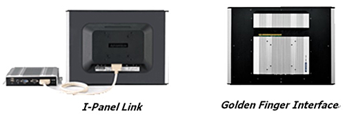 Advantech provides extendable and pluggable designs that integrate embedded IPCs and displays. The ARK-1503 with I-Panel link interface integrates LVDS, USB, Tx/Rx signals, audio, and DC power through a DB36 SCSI connector, so a single cable supports a touch panel with power, video, audio, and touch info. And the alternate, 164-pin golden-finger option carries everything, including power, video (LVDS HDMI), audio, USB, COM and touch panel signaling; it supports an ITM touch monitor by direct golden-finger docking, with no cable at all, yet system and monitor can be upgraded independently, for more flexibility, better stability, and easy installation.