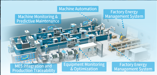 Advantech integrates automation and cloud technology into smart factory solutions in the six dimensions of machine automation, machine monitoring and predictive maintenance, MES integration and production traceability, factory energy management, factory environment monitoring, and equipment monitoring and optimization to facilitate the realization of Industry 4.0.